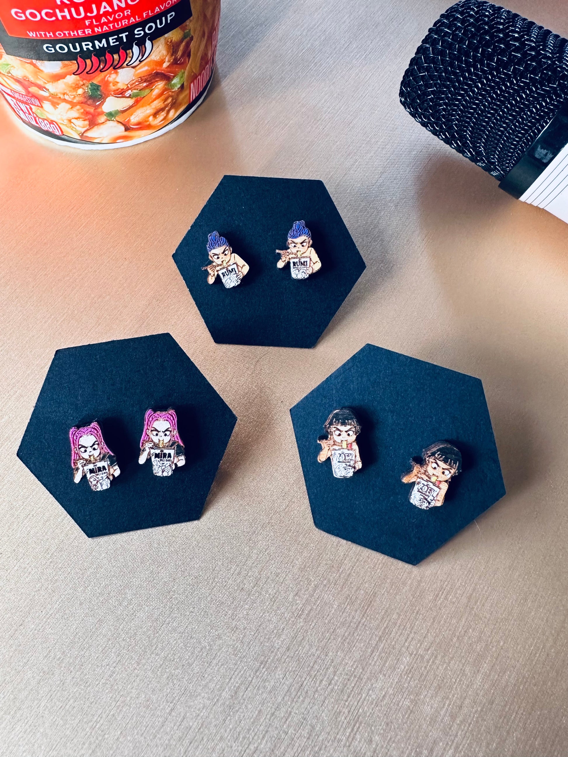 The girls are here and ready to slay! This listing is for Rumi. Studs are made from wood, handpainted with a stainless steel post.